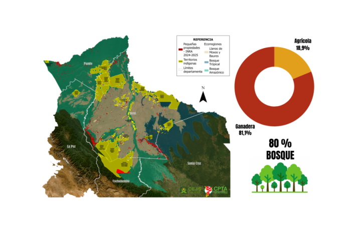 La reconversión agraria impulsada por la recién promulgada Ley 1720 podría beneficiar principalmente a los ganaderos de Santa Cruz y el Beni, donde se concentra la mayor parte de la pequeña propiedad ganadera de hasta 500 hectáreas. La norma permite que estas propiedades accedan a diez años de suspensión en la verificación de la Función Económica Social (FES) al pasar a la categoría de mediana propiedad, una medida que, según el CEJIS, incrementará la presión sobre los territorios indígenas. En Bolivia, según el INRA (2025), 9,4 millones de hectáreas fueron tituladas en condición de pequeña propiedad agraria (de 50 hectáreas)