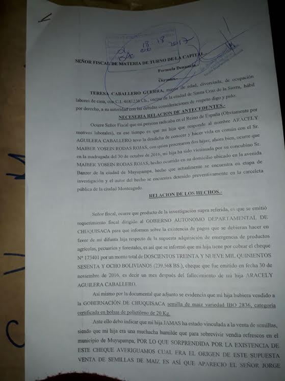 Teresa se enteró del cheque en los primeros días de mayo, cuando la buscó Jorge Céspedes Terrazas, representante de una asociación de semillas de Muyupampa, provincia Luis Calvo de Chuquisaca, para pedirle que viabilice el reconocimiento “del matrimonio de hecho de su hija con el hombre que la mató para que éste se declare heredero y pueda cobrar un cheque”.