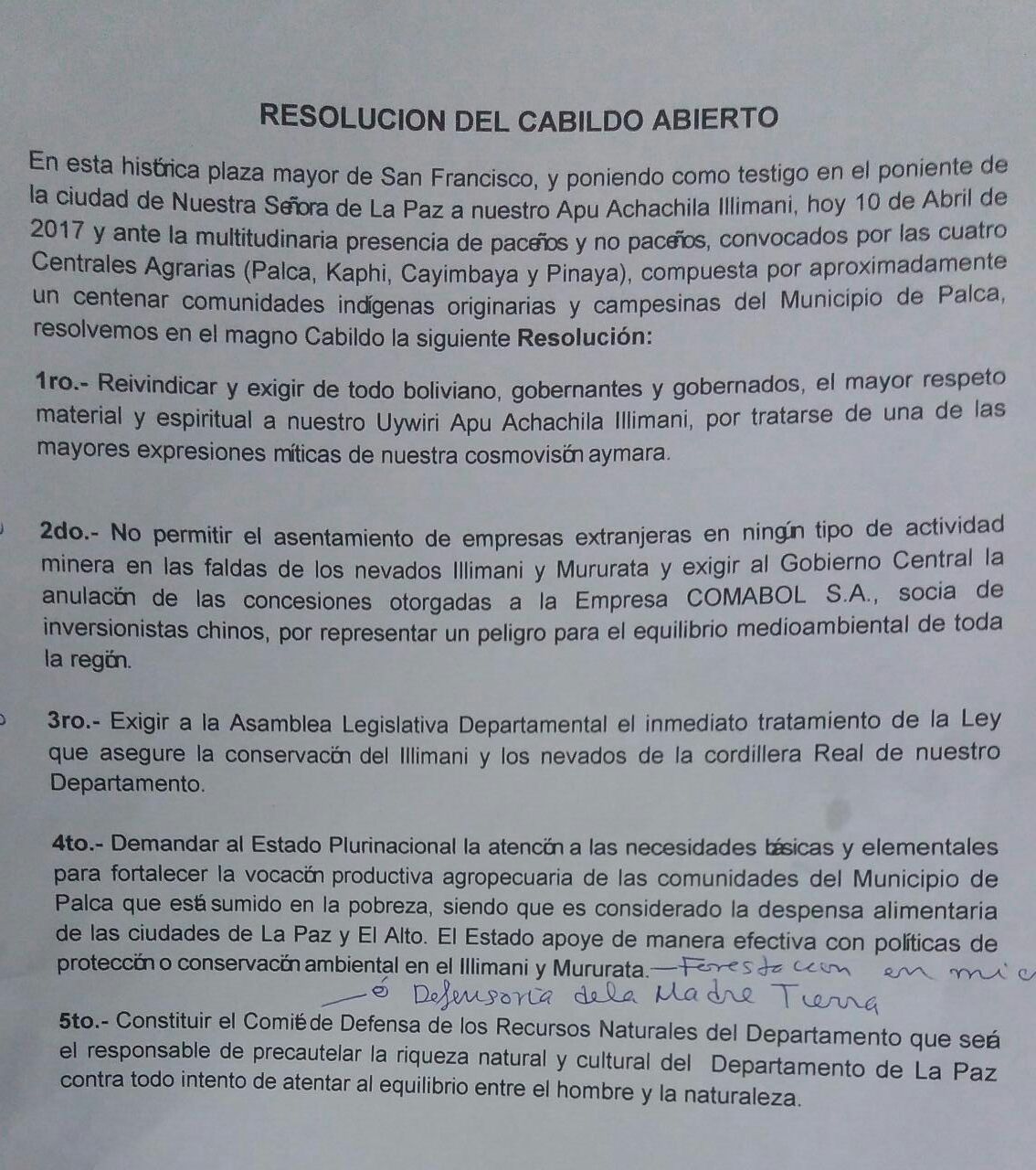«No vamos a permitir, los vamos a sacar a chicotes y eso fue lo que decidieron las bases. La explotación minera provocará daños a las aguas del río y eso va a contaminar los cultivos y la producción agrícola con que se abastece La Paz, todo sería contaminado”, advirtió el dirigente Nicolás Cruz en contacto con los medios de comunicación.