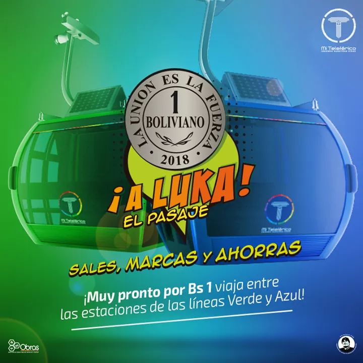 ¡Muy pronto por Bs1entre las estaciones de las líneas verde y azul!, señala la empresa Mi Teleférico, en su campaña publicitaria a “luka el pasaje”.
