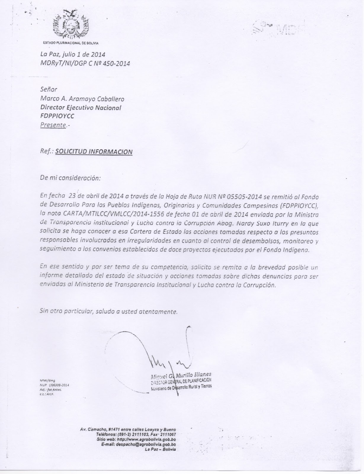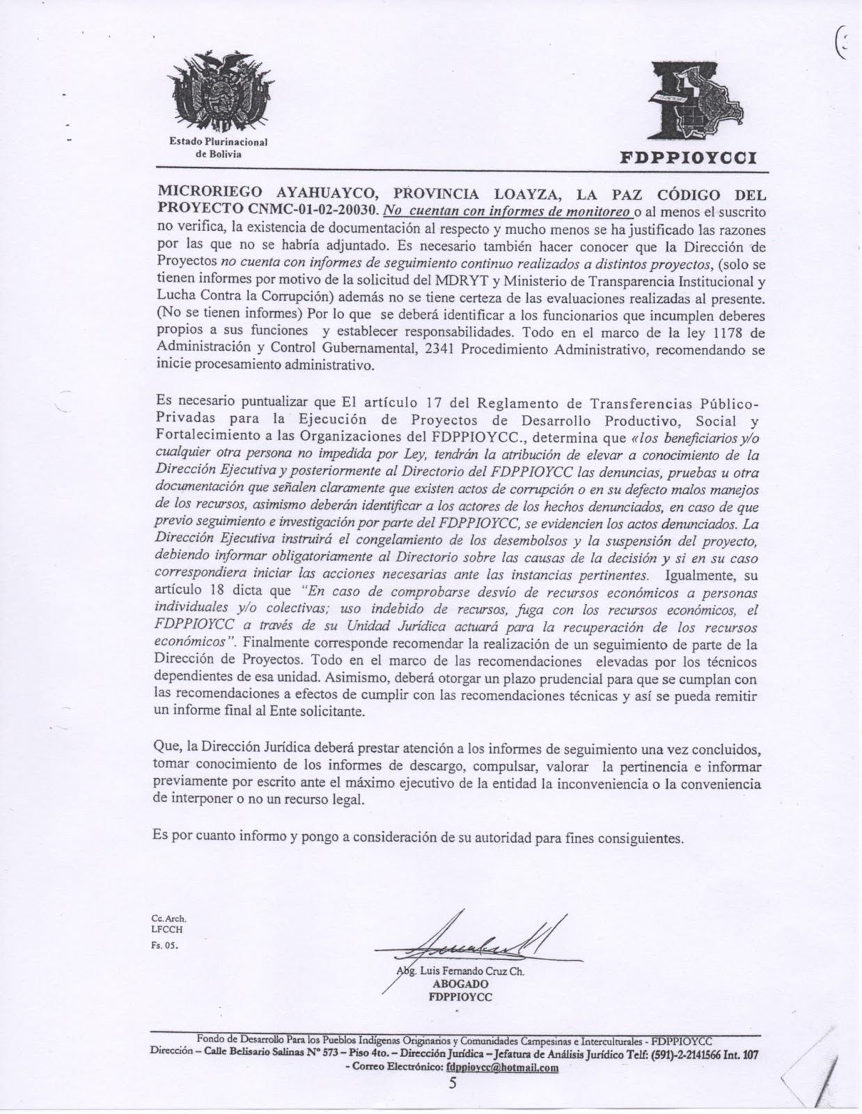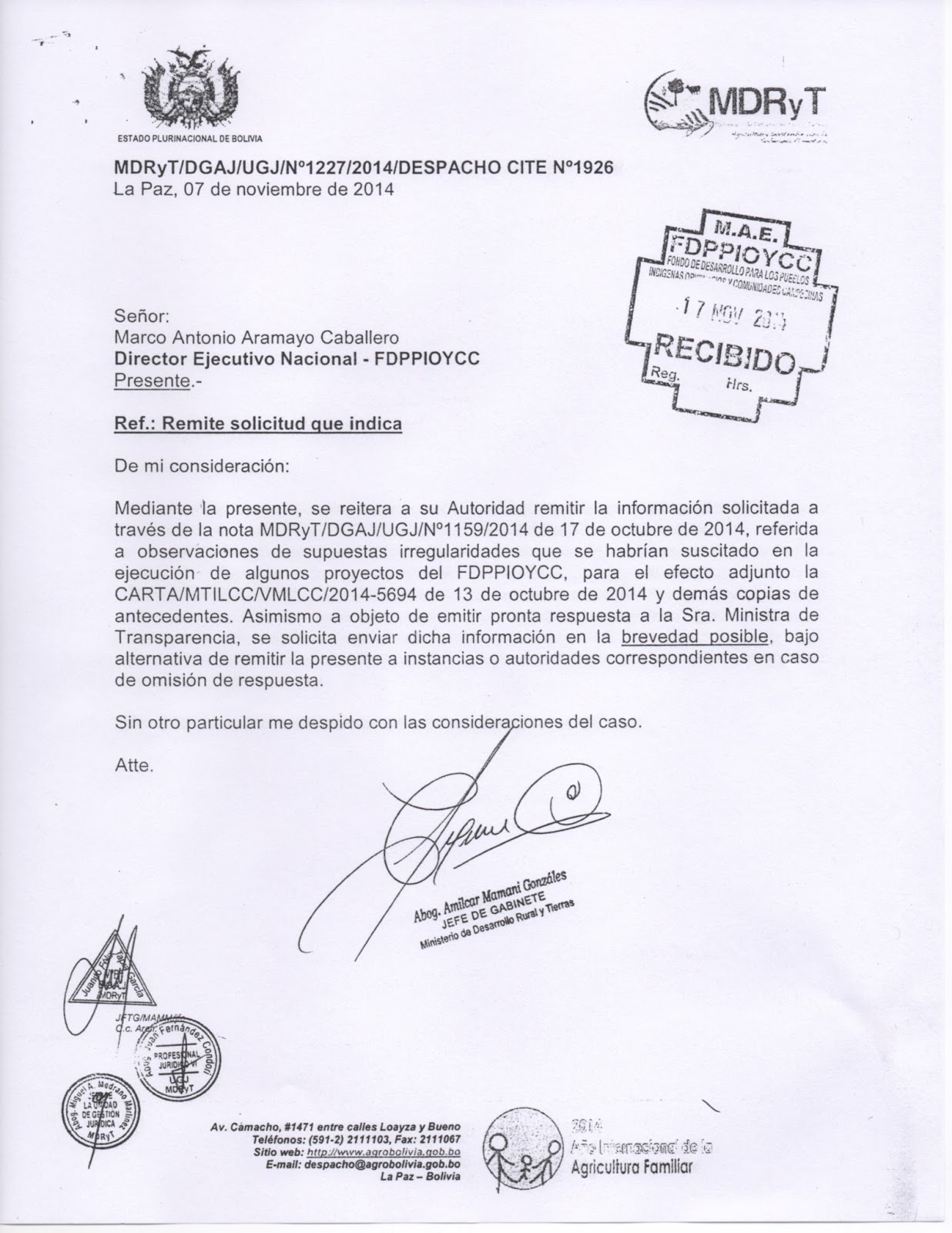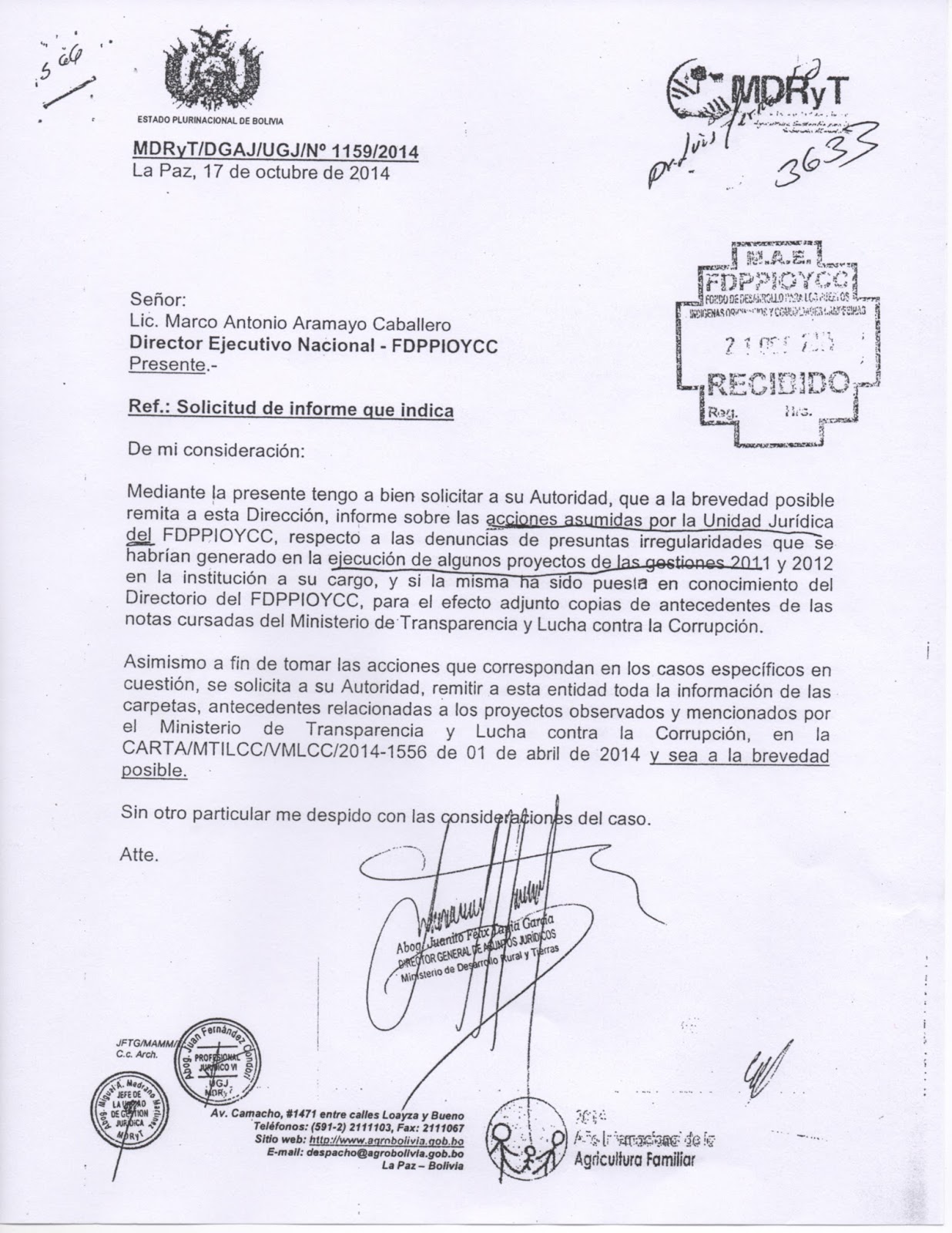 El pasado martes, el abogado de la exministra, Édgar Soliz, señaló que su cliente solicitó a los exdirectores del Fondioc informes en 22 oportunidades, entre ellas a Aramayo en 12 ocasiones. Según el abogado, ninguno de los directores respondió, a quiénes acusó, además, de ocultar información.