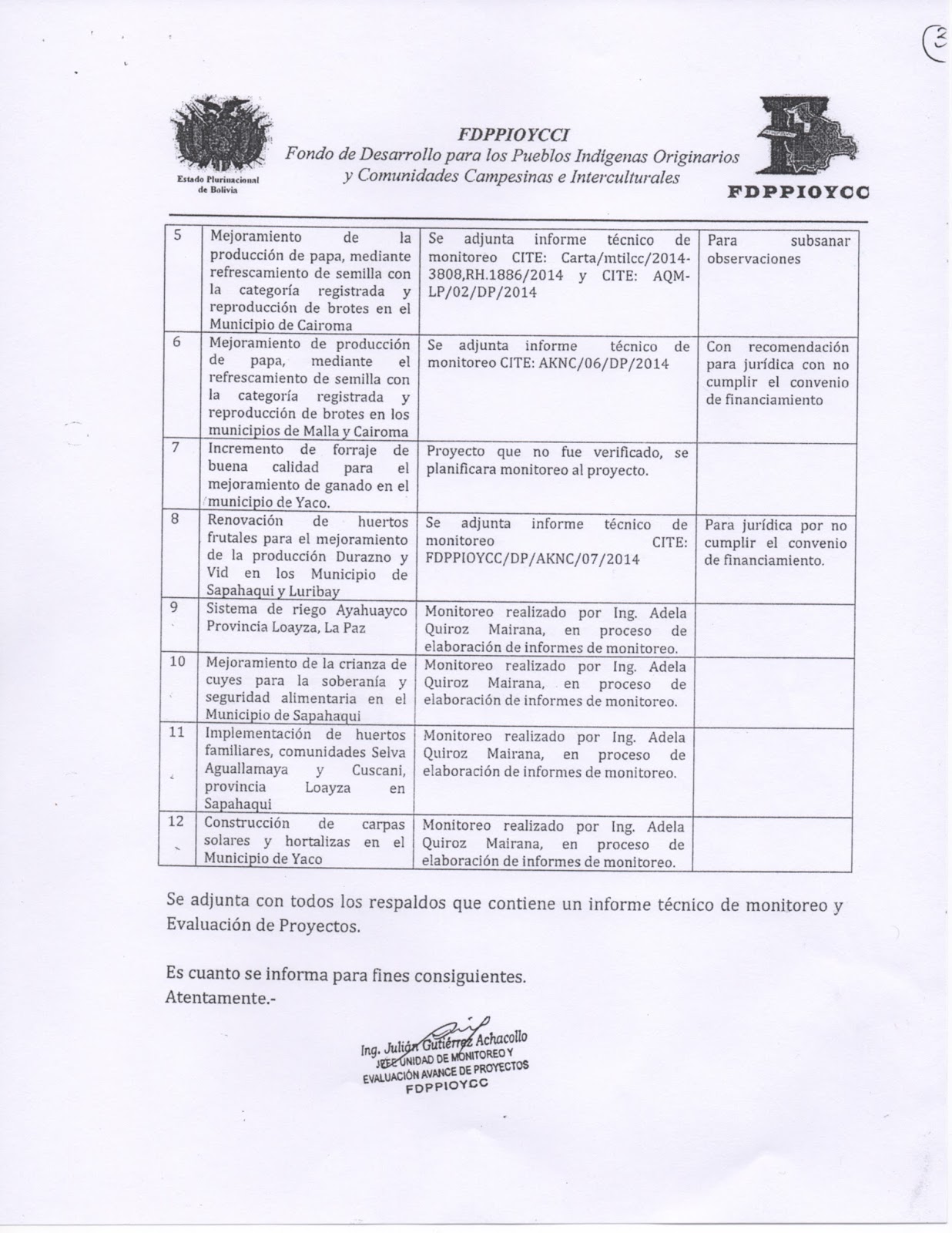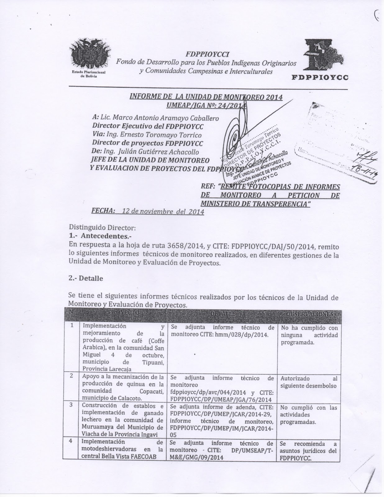 “Nunca pidió informes sobre los 153 proyectos al 100 por ciento de desembolso que denuncie yo en septiembre de 2013 y en reiteradas veces en informes y rendición pública de cuentas”, manifestó Aramayo.