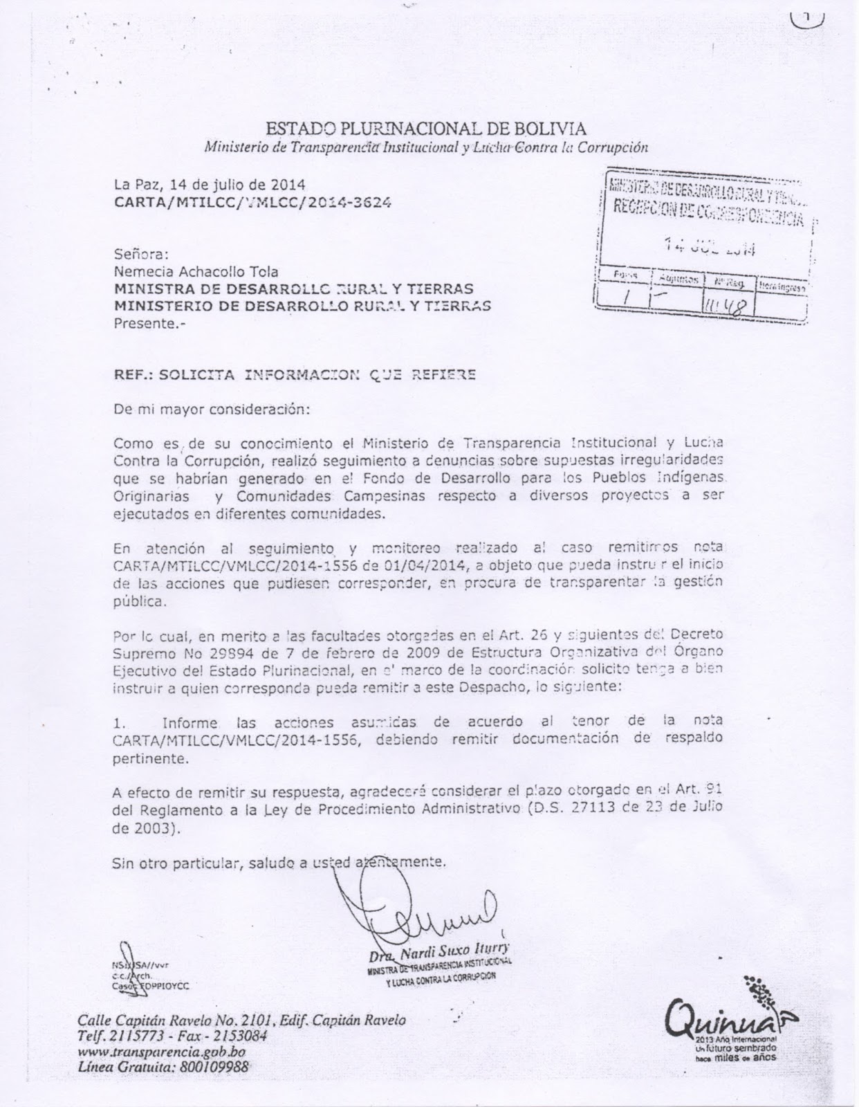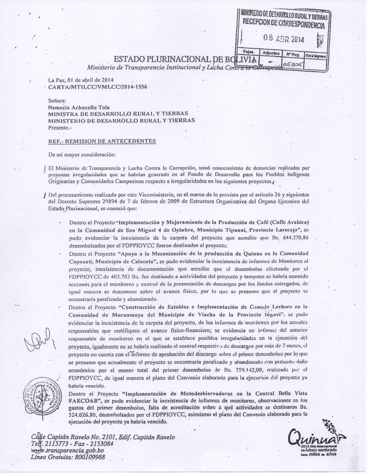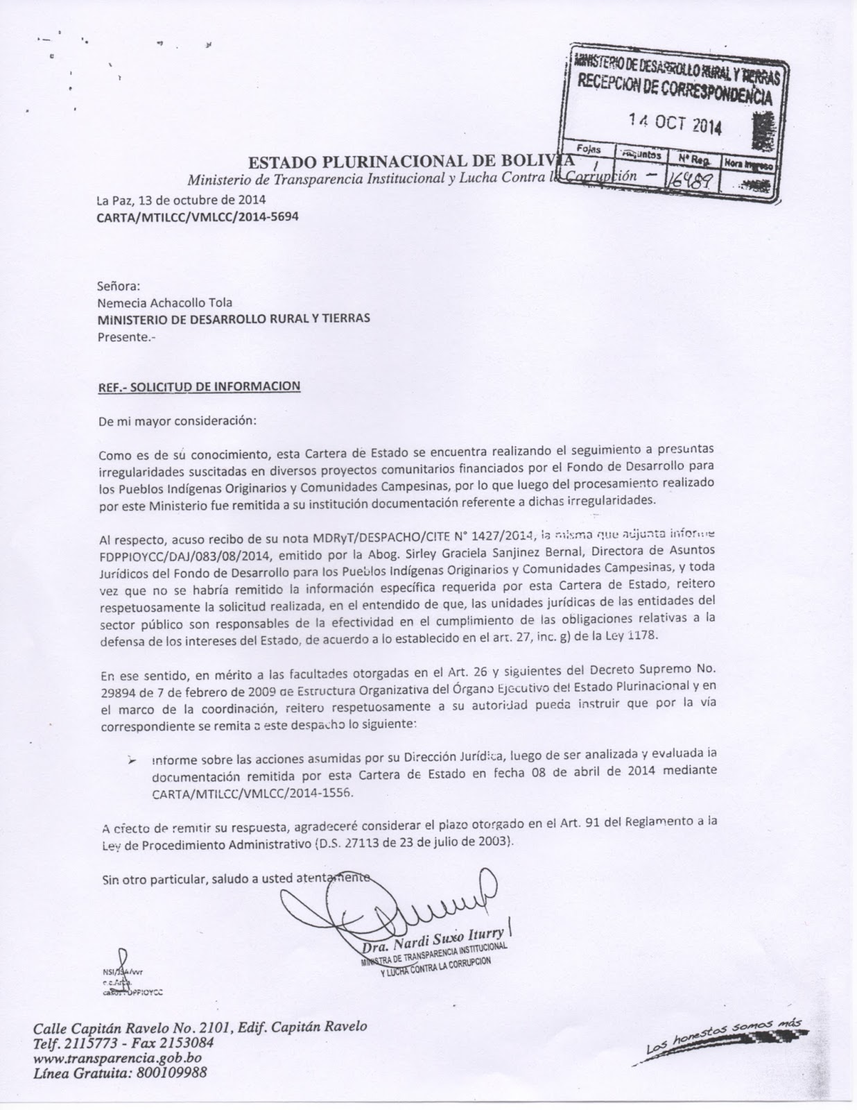 “Nemesia pidió informes solo cuando la ministra Nardy Suxo pedía información”, manifestó y agregó que “en toda la gestión 2014 sólo pidió informes reiteradas veces sobre 12 casos de denuncias a Transparencia (Ministerio) y siempre lo hacía a través de su unidad de transparencia, el señor Arturo Lira”.