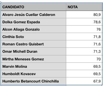 - Álvaro Cuellar, que tiene mayor puntaje, es parte del equipo de los ex Consejeros destituidos en juicio ante la Asamblea Legislativa. Trabajó en el Consejo desde el 2012, primero como Consultor y al final de su gestión como Director Nacional de Políticas de Gestión del Consejo de la Magistratura. Actualmente trabaja como funcionario del Gobierno Autónomo Municipal de Sucre, entidad gobernada por el MAS.