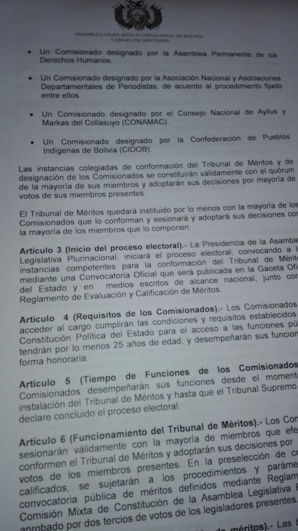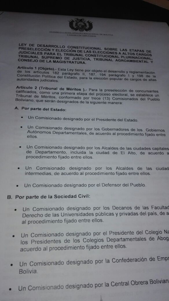 “Para la preselección de concursantes calificados, como una primera etapa del proceso electoral, se establece un Tribunal de Méritos, conformado por trece (13) comisionados del pueblo boliviano”, señala el artículo dos de este anteproyecto.