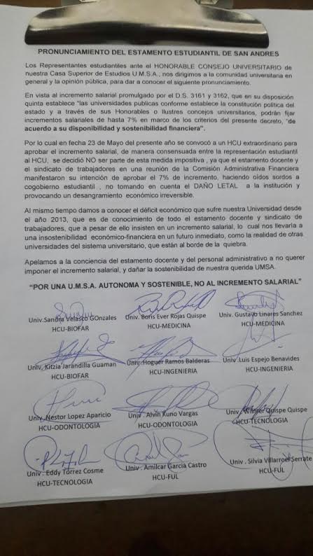 Dirigentes estudiantiles de la UMSA rechazan incremento del 7% a docentes y administrativos