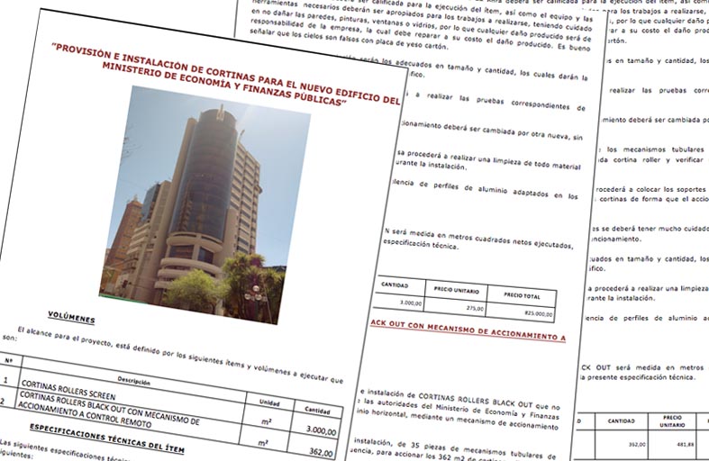 “Este ítem comprende la fabricación e instalación de CORTINAS ROLLERS BLACK OUT que no permiten el paso de luz en oficinas de las autoridades del Ministerio de Economía y Finanzas Públicas, y se enrolla a un eje de aluminio horizontal, mediante un mecanismo de accionamiento a control remoto”, especifica el documento.