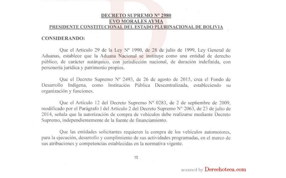 El gobierno autorizó a la Aduana Nacional la compra de 63 vehículos, tipo estándar, para uso operativo en actividades propias de la entidad; y otros dos para el Fondo de Desarrollo Indígena, rebautizado hoy como Fondo de Desarrollo Indígena, según consta en el Decreto Supremo 2980.
