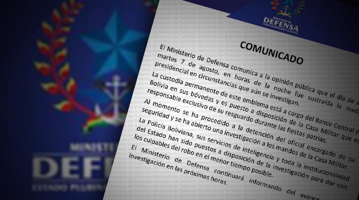 El Ministerio de Defensa informó hace minutos que el oficial encargado de la seguridad de la medalla presidencial está detenido y «se ha abierto una investigación a los mandos de la Casa Militar».