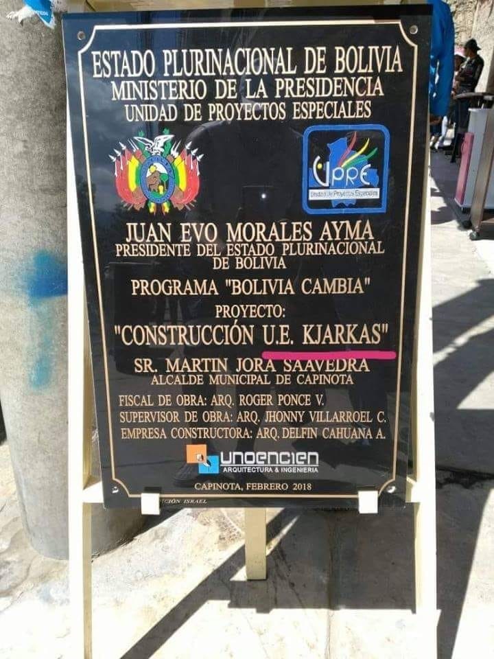 La obra, que costó Bs7.192.506, será entregada en un acto en el que participarán el Presidente Evo Morales Ayma y, por supuesto, los integrantes del grupo Kjarkas, según una invitación difundida por el director de esta unidad Educativa, Ramiro Chungara, a través de Facebook.