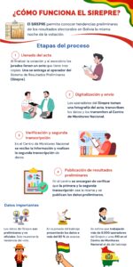 El Sistema de Resultados Preliminares (Sirepre) ofrecerá resultados no oficiales de la segunda vuelta electoral hasta más del 80% durante la jornada de votación; pero, si la distancia es menor al 2 % entre los dos candidatos, los datos serán analizados por los tribunales electorales departamentales (TEDs), con la finalidad de dar certidumbre a la población. Estos resultados no son vinculantes a los oficiales.