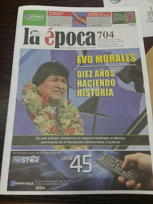 El semanario La Época, de línea editorial de apoyo al gobierno de Evo Morales, tiene en su última edición (del domingo 17 al sábado 23 de enero) cuatro páginas  de publicidad de instituciones vinculadas al gobierno, tres cuartos de página de una institución del Estado y una página (la contratapa) de Viva.