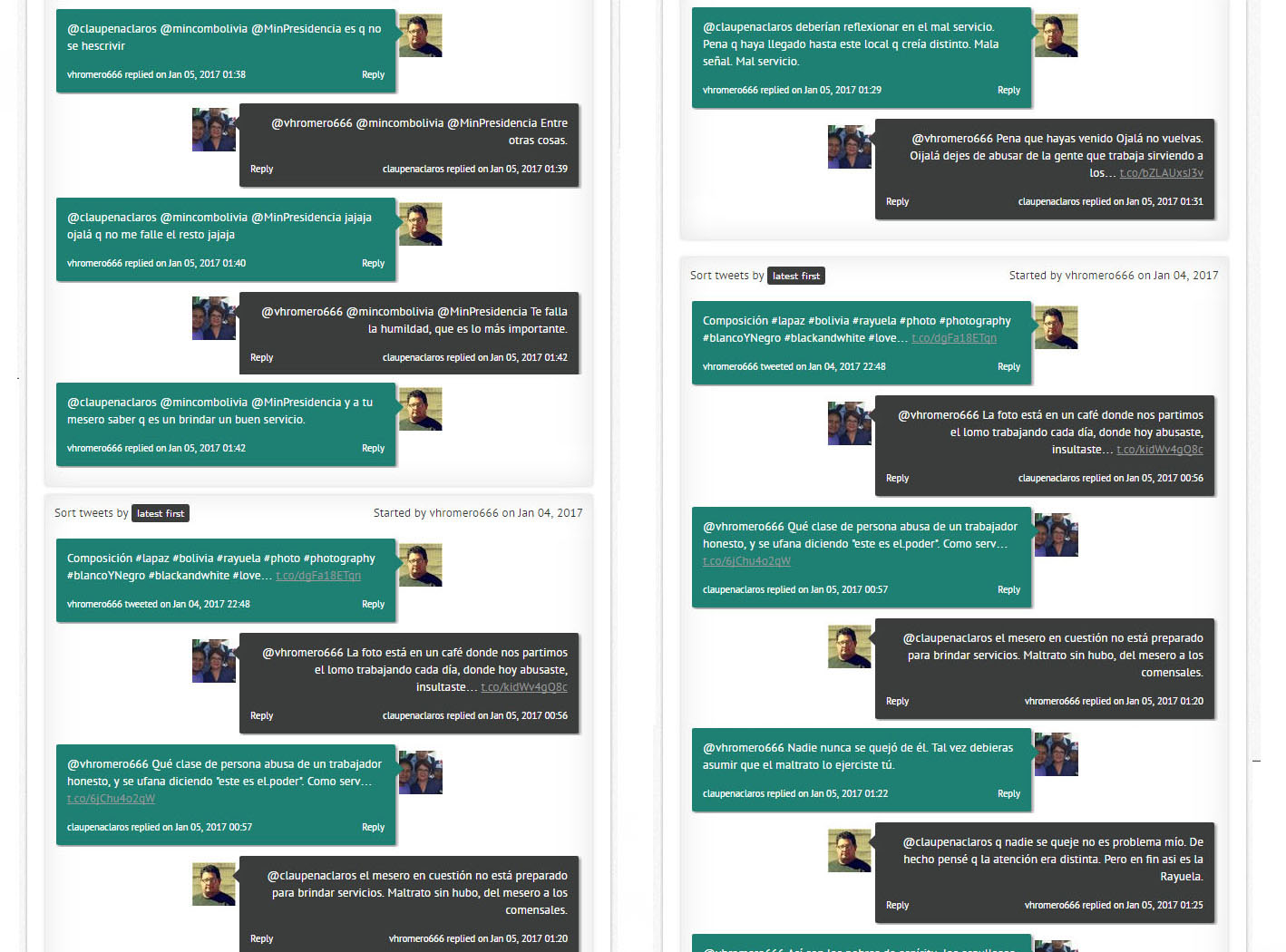 El hecho sucedió este miércoles a eso de las 14 horas en el café Rayuela, que está ubicado en la zona paceña de Obrajes y cuyas propietarias son Claudia Peña Claros, exministra de Autonomías, y Verónica Mendizabal López. Al lugar llegó Victor Hugo Romero, asesor de la ministra de Comunicación, Marianela Paco, y pidió dos almuerzos.