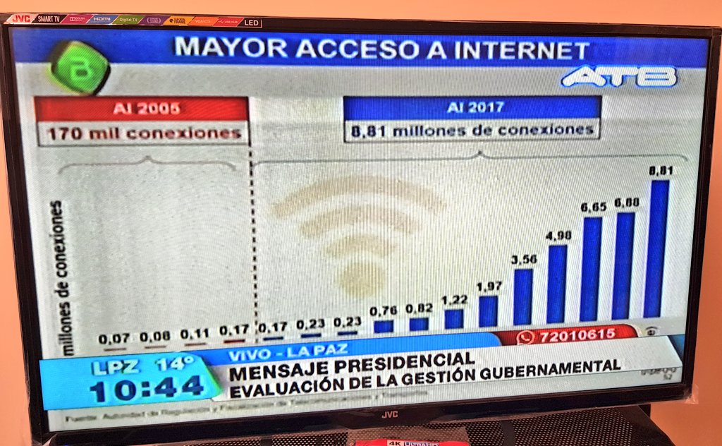 El presidente Evo Morales señaló ayer, en su informe al país, que entre sus logros están las 8.81 millones de conexiones a internet. Así como fue presentado ese dato, uno puede creer que casi toda la población boliviana (10.89 millones) tiene acceso a la red a través de conexión fija. No es así.