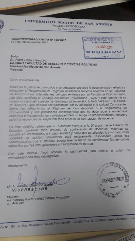 Exigen frenar contratación de docentes en Derecho-UMSA porque infringe reglamento y valida “post grado sin título”