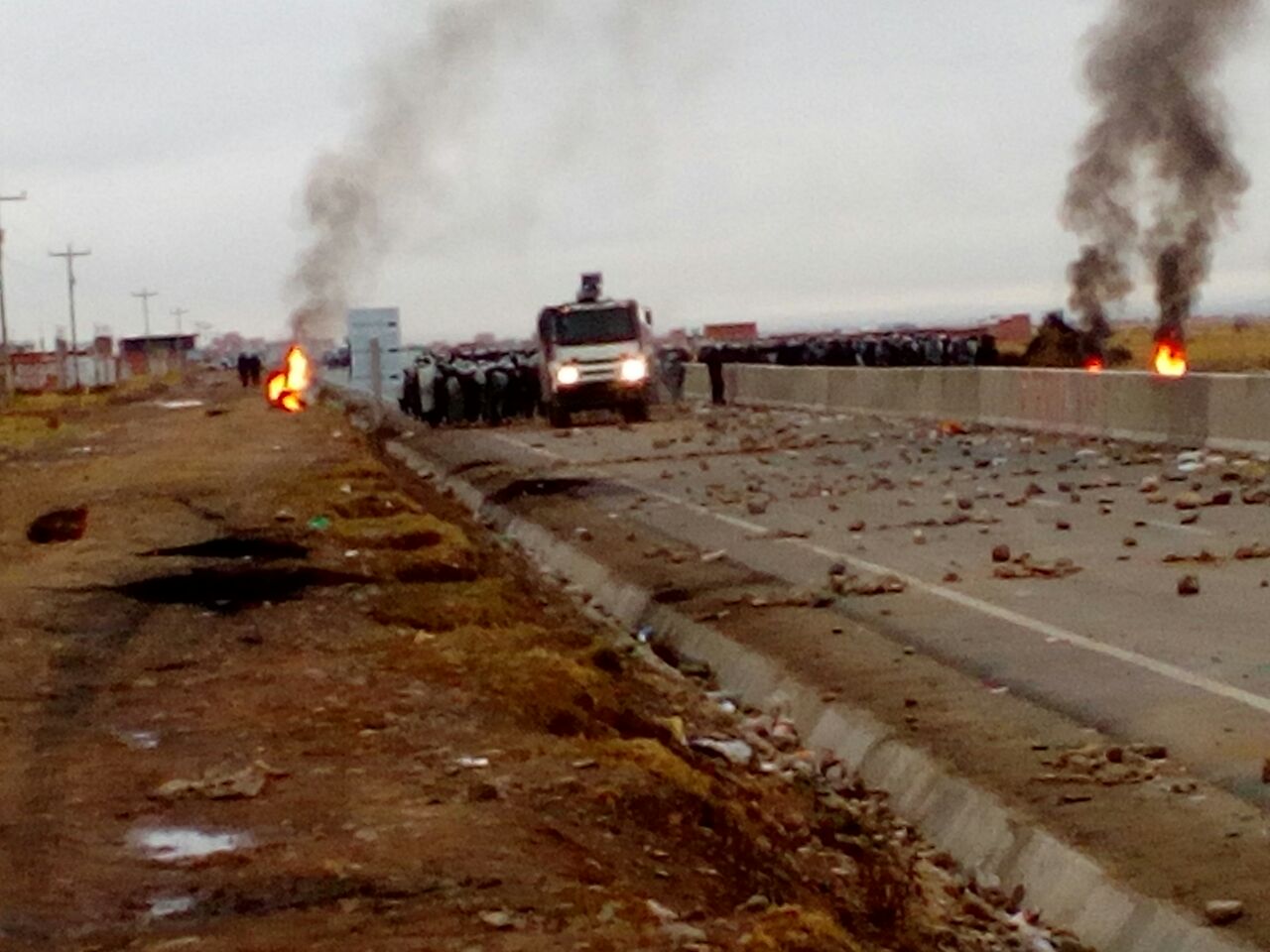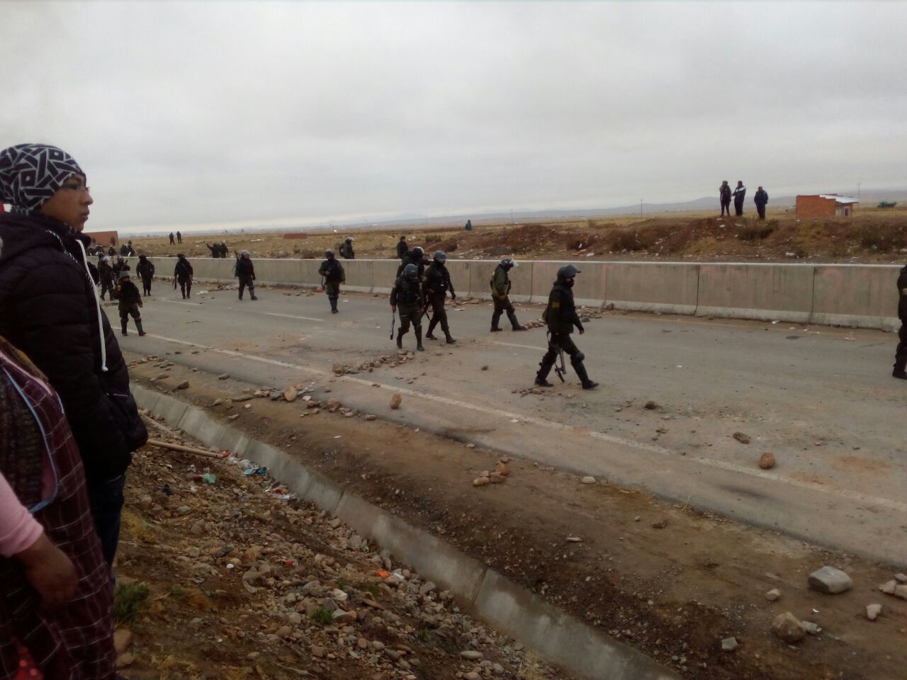 “Estamos pidiendo más refuerzo a los hermanos ponchos rojos, a la población de Achacachi; por favor residentes de La Paz, hoy nos han atropellado nuevamente a las seis de la mañana”, indicó el vecino y agregó que los policías quemaron carpas, hostigaron mujeres y detuvieron a una persona.