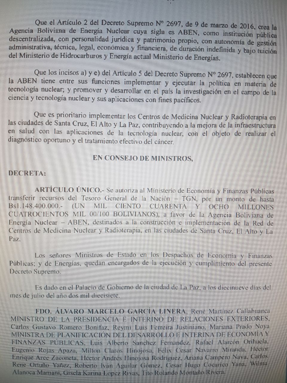 Gobierno transfiere más de mil millones de bolivianos para tres «centros de medicina nuclear»