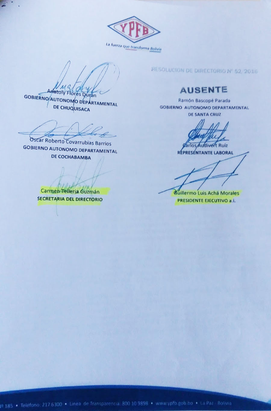 La resolución está firmada por Carmen Tellería Guzmán, en su condición de Secretaria del Directorio y hoy involucrada en el caso de corrupción denominado Taladros. También firma el mismo Guillermo Achá, investigado por el mismo caso.