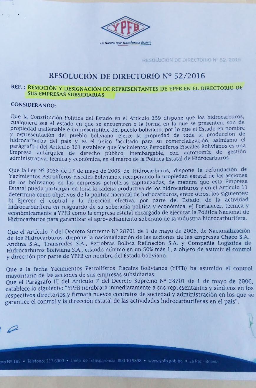 “Los Directorios de las empresas subsidiarias son máximas instancias de decisión sobre las políticas comerciales y estratégicas de las empresas, por lo que es necesario efectuar las modificaciones necesarias en la designación de sus representantes para el desarrollo de sus actividades de una manera óptima”, indica el documento fechado el 7 de julio de 2016.