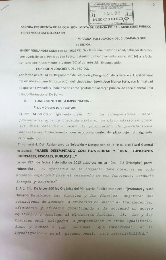 El médico Jhery Fernández Sumi (foto), sentenciado injustamente en el caso “Bebé Alexander”, impugnó la postulación del abogado Edwin José Blanco Soria al cargo de Fiscal General del Estado Plurinacional. En su memorial presentado ayer a la Asamblea Legislativa Plurinacional, señaló nueve fundamentos.