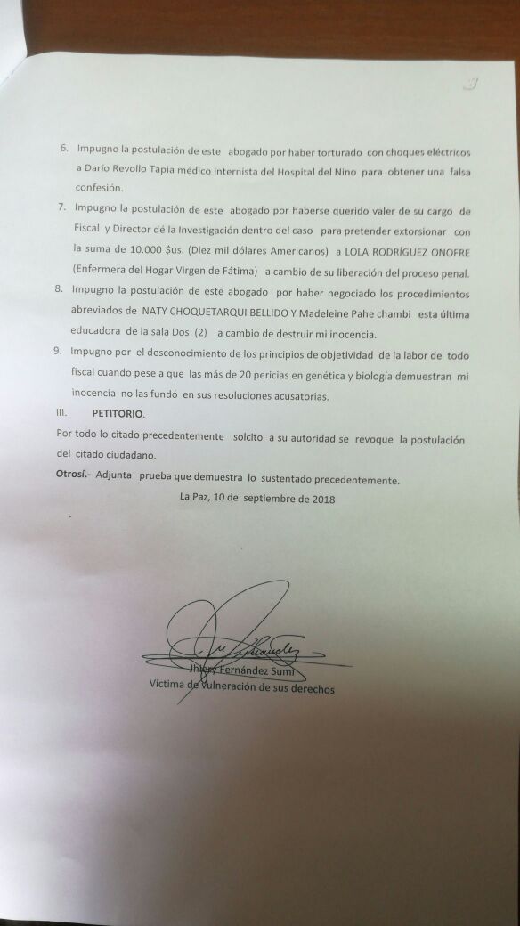 “Impugno su postulación por haberme dado muerte civil (…) valiéndose de su cargo para amedrentar a los testigos”, señala la segunda fundamentación.
