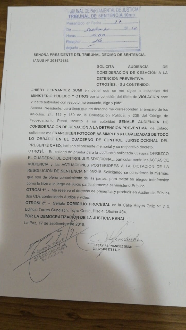 Jhiery pide a la jueza que lo condenó sin pruebas liberarlo; anuncia que presentará audios y video en audiencia