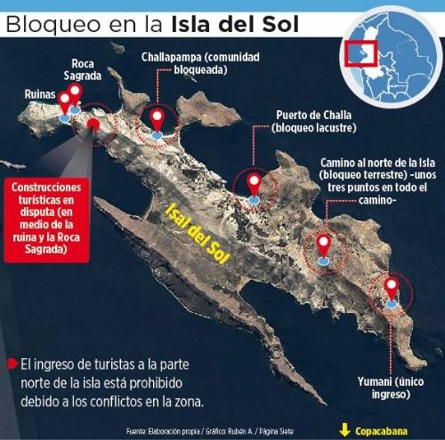 La localidad de Challapampa, está situada en la parte Norte de la Isla del Sol, del municipio de Copacabana de la provincia Manco Kapac del departamento de La Paz – Bolivia, en ella se encuentran varios sitios arqueológicos –ante todo sagrados para las comunidades aimaras- desde hace varios meses atrás está siendo objeto de construcciones civiles (con materiales no procedentes del lugar) siendo ilegales, que afectan el área arqueológica protegida por normas nacionales e internacionales, catalogando a estas sitios espirituales de patrimonio ancestral cultural y de la humanidad.
