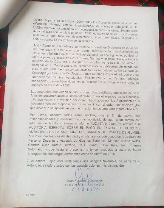 En el punto quinto de su misiva, el exjefe de Personal Docente de la UMSA recordó que a partir de la gestión 2006 todos los docentes observados, de las diferentes carreras, estaban imposibilitados de continuar trabajando en la UMSA, mientras no presenten la documentación correspondiente.