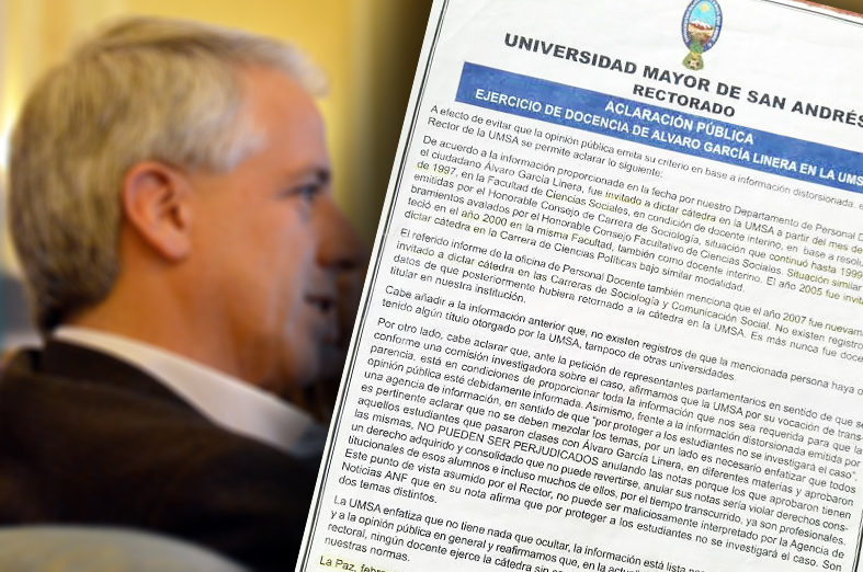 Fuentes se enteró del retorno de García en febrero del año pasado a través de un comunicado de la UMSA. “De acuerdo a la información proporcionada en la fecha por nuestro Departamento de Personal Docente, el ciudadano Álvaro García Linera, fue invitado a dictar cátedra en la UMSA a partir del mes de agosto de 1997 en la Facultad de Ciencias Sociales (…). El año 2005 fue invitado a dictar cátedra en la carrera de Ciencias Políticas”, señaló el comunicado.