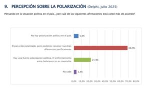 Un estudio Delphi de la Fundación Friedrich Ebert Stiftung (FES) publicado en julio de este año en el que se consulta a actores políticos, periodistas y analistas indica que un 16,4 % atribuye que la situación política del país es mala por la polarización ideológica. Además, un 68,9 % cree que el país está polarizado, pero que se pueden resolver las diferencias pacíficamente, mientras que un 21,9 % señala que por la fuerte fragmentación “el enfrentamiento es inevitable entre bolivianos”.