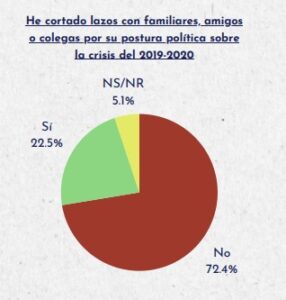 Esa fractura no es solo política: también toca la vida íntima. Dos de cada diez personas reconocieron haber roto lazos con familiares, amigos o colegas por su postura sobre la crisis de 2019. No es una cifra abstracta: detrás de ella hay almuerzos tensos que terminaron en silencio, grupos de WhatsApp familiares que se deshicieron, amistades de años que ya no se hablan. La política penetró los afectos.