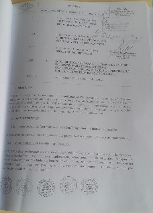 Según un informe técnico de la estatal petrolera, el primer Contrato se firmó el 7 de diciembre de 2012 entre YPFB y la empresa Tecnimont S.p.A. para “la realización de los estudios de ingeniería conceptual de las plantas de etileno y polietileno” en la provincia Gran Chaco.