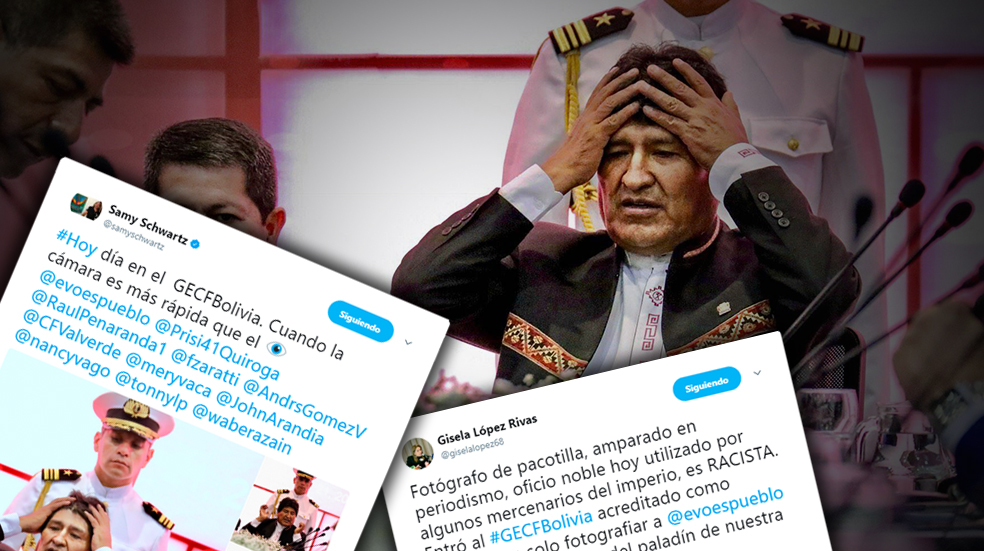 Fotógrafo de pacotilla, amparado en periodismo, oficio noble hoy utilizado por algunos mercenarios del imperio, es RACISTA. Entró al #GECFBolivia acreditado como periodista a solo fotografiar a @evoespueblo para intentar mofarse del paladín de nuestra democracia #EvoElMejorPresi— Gisela López Rivas (@giselalopez68) 22 de noviembre de 2017
