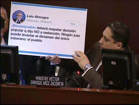 El gobierno del Estado Plurinacional exigió hoy al consejo permanente de la Organización de Estados Americanos (OEA) censurar al secretario general Luis Almagro por haber pedido, mediante el twitter, respeto al voto del referéndum del 21F, tuit considerado por el MAS como una «injerencia». En respuesta, Gonzalo Koncke, jefe de gabinete de Almagro, recordó que una acción judicial no puede impugnar la voluntad popular, manifestada a través del voto y que dijo NO a la reelección.