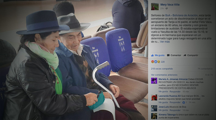 “Señores de BoA – Boliviana de Aviación, esta tarde cometieron un acto de discriminación al dejar en el aeropuerto de Tarija a mi padre, el señor Felix Vaca, un anciano de 80 años, no vidente y con graves limitaciones de audición”, señala Vaca en su muro de Facebook.