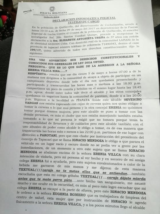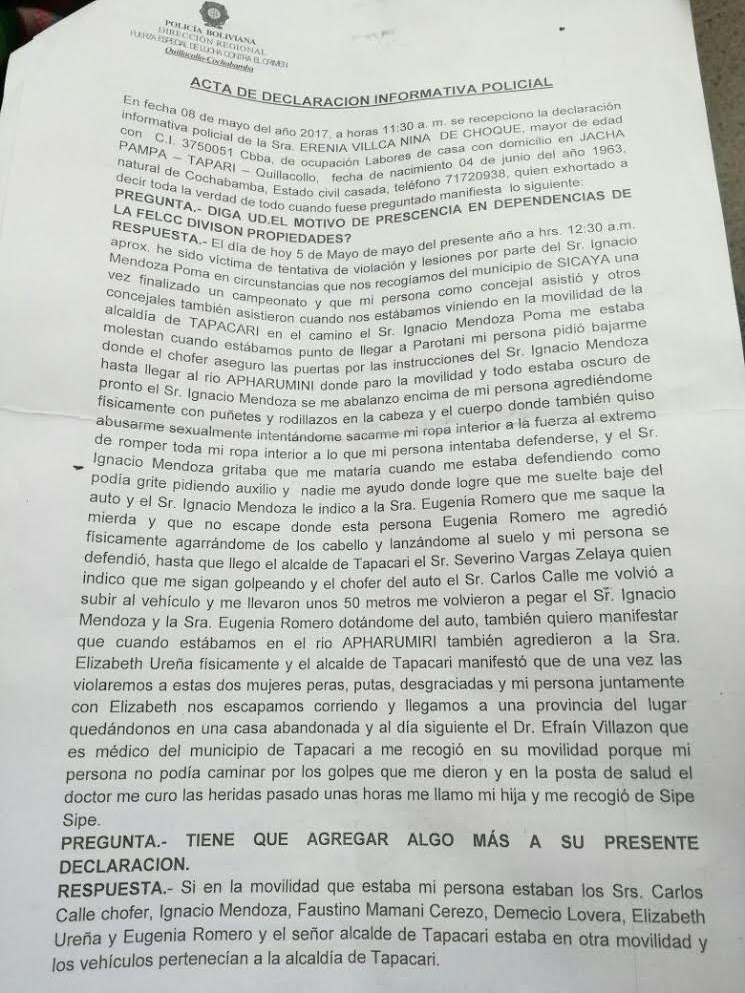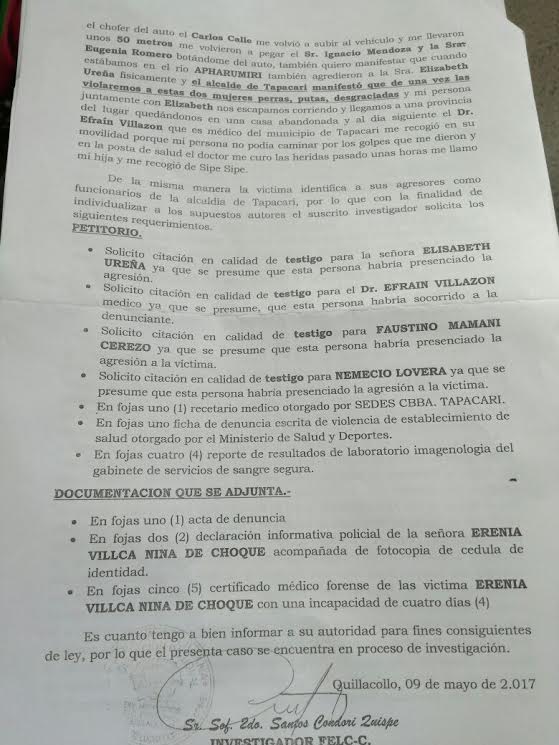 Erenia hoy está en un hospital de Cochabamba con graves lesiones físicas. Presentó una querella contra Ignacio Mendoza, Severino Vargas, Eugenia Romero y Carlos Calle. Pide justicia.