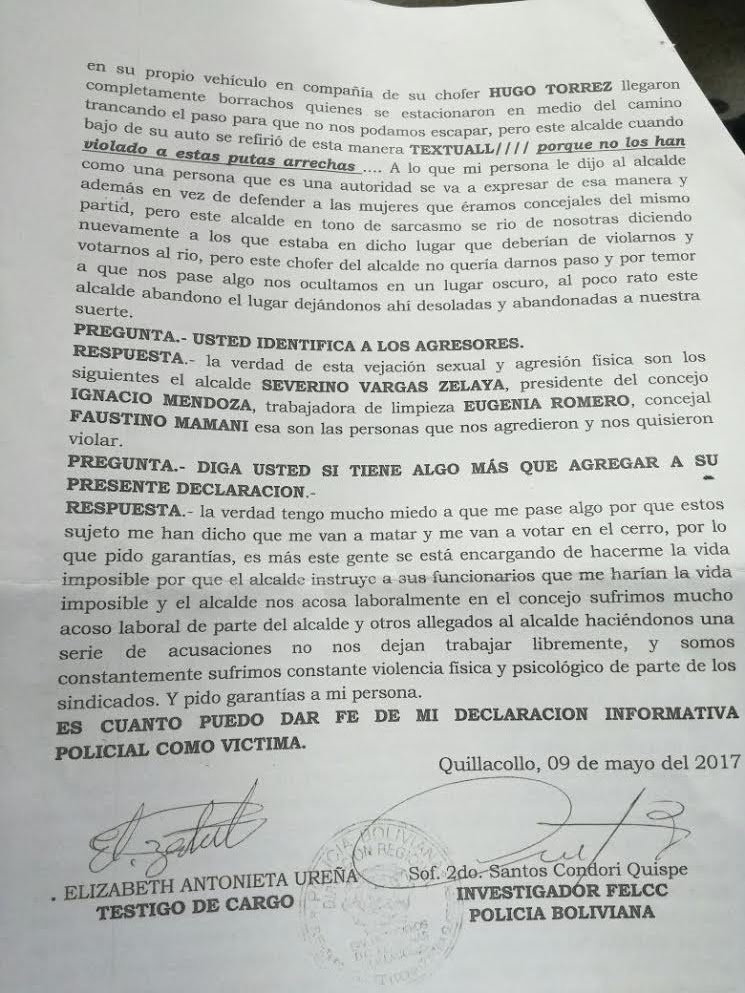 El Alcalde se fue en «su vehículo» y el Presidente del Concejo, junto a sus acompañantes, en «el suyo». Dejaron abandonadas a sus compañeras de partido político (MAS) en un lugar donde solo había oscuridad y silencio.