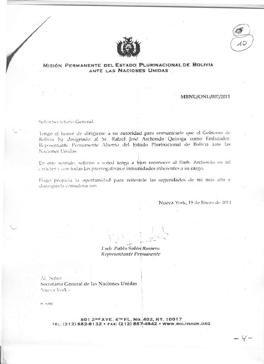 Romero comunicó el 19 de enero de 2011 al Secretario General de la ONU que “el gobierno de Bolivia ha designado al Sr.