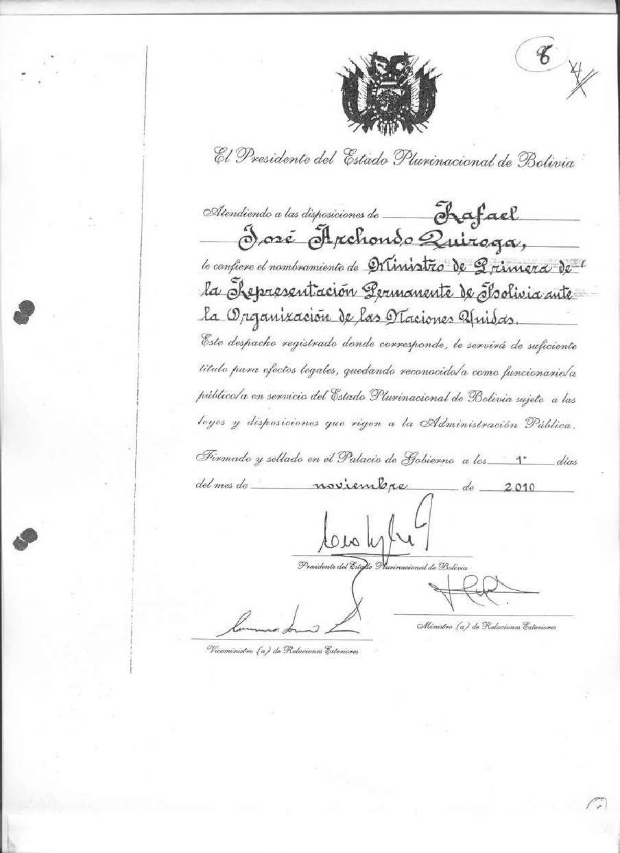 Rafael José Archondo Quiroga como Embajador Representante Permanente Alterno