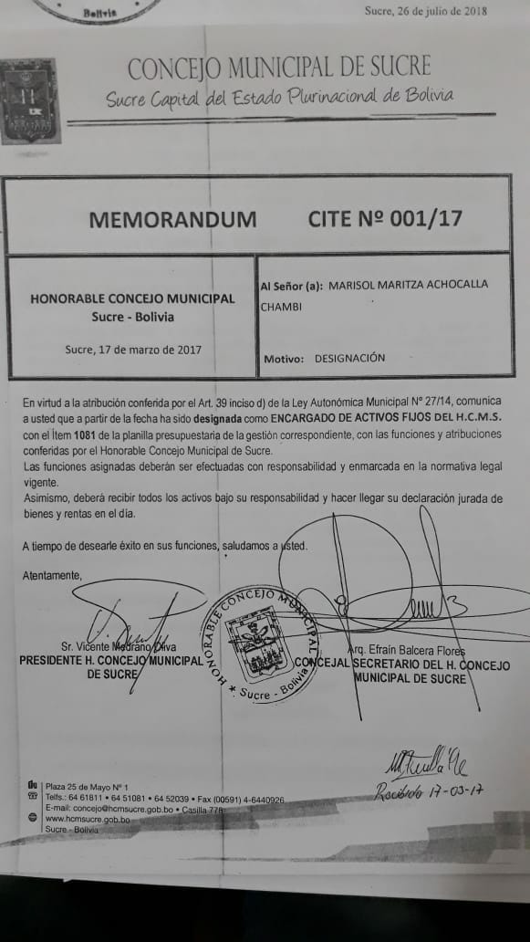 El concejal del Movimiento Al Socialismo (MAS), Efraín Balcera, designó a su cuñada, Marisol Maritza Achocalla Chambi, como Encargada de Activos Fijos del Concejo Municipal de Sucre, según consta en el memorando 001/17, verificado por el programa “Periodismo que Cuenta”.
