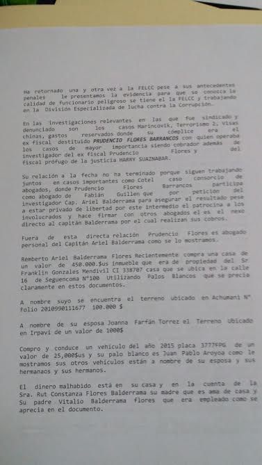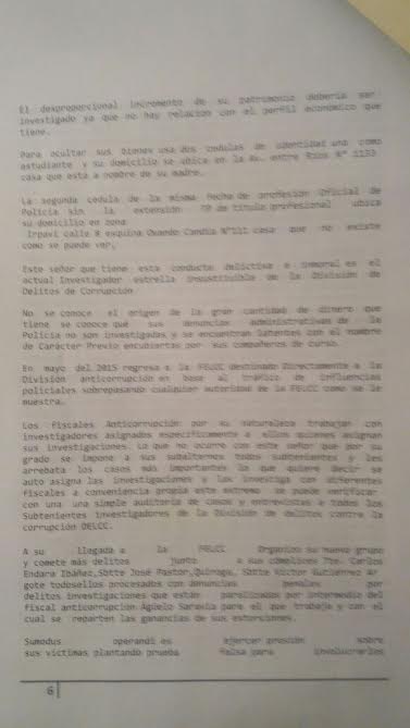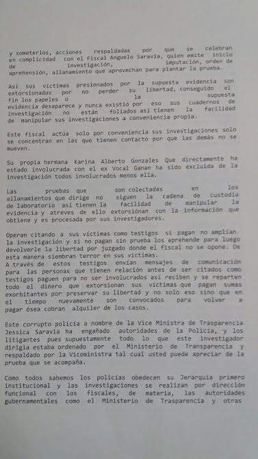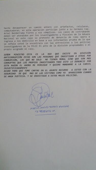 En su carta, Morales señaló otros hechos, pidió auxilio al Ministro de Gobierno y reiteró que existe esta «Red Criminal» en la División Anticorrupción. «Estas son las personas que investigan a otras por corrupción, las que no solo no tienen moral, sino que son más corruptas que los propios investigados», puntualizó.