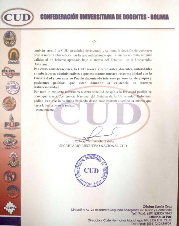 Además, agregó, que puso en conocimiento del Honorable Consejo Universitario (HCU) “semejante atropello contra la UMSA, para que sea esta instancia la que decida las medidas a tomar, incluyendo nuestra participación en el proceso de selección de candidatos a la magistratura judicial, precisamente porque estamos advirtiendo que no se está actuando con la debida transparencia, independencia política e idoneidad necesaria”.