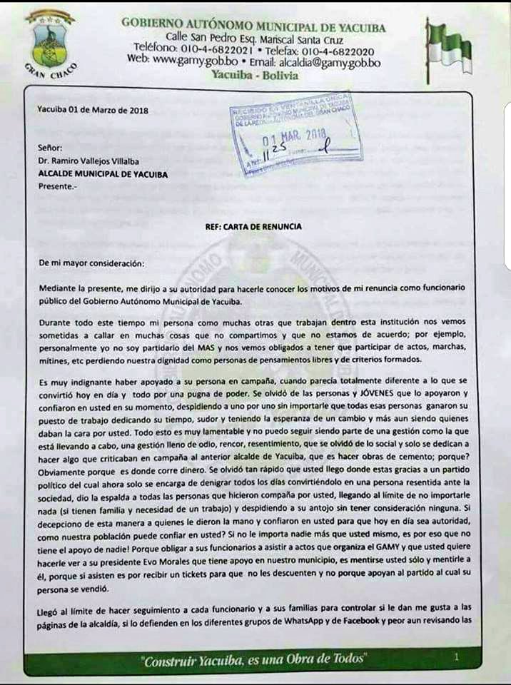 “Yo no soy partidario del MAS (Movimiento al Socialismo) y nos vemos obligados a tener que participar de actos, marchas, mitines, etc., perdiendo nuestra dignidad como personas de pensamientos libres y de criterios formados”, así comienza la carta de renuncia de Raúl Oropeza Corrales, funcionario de la Alcaldía de Yacuiba, Gran Chaco, Tarija.Un funcionario cuenta cómo un alcalde vigila las RRSS y obliga a ir a eventos del MAS