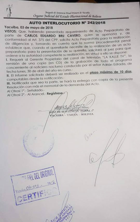 Días después de ese programa, el 4 de mayo, el fiscal departamental de Tarija, Carlos Oblitas, resolvió rechazar la denuncia que había sido planteada contra Carlos Brú, debido a que, en su criterio, no hubo daño económico en la compra de las 12.500 computadoras para los estudiantes del municipio de Yacuiba.Viceministro Brú prepara juicio contra un periodista por informar sobre caso de sobreprecio