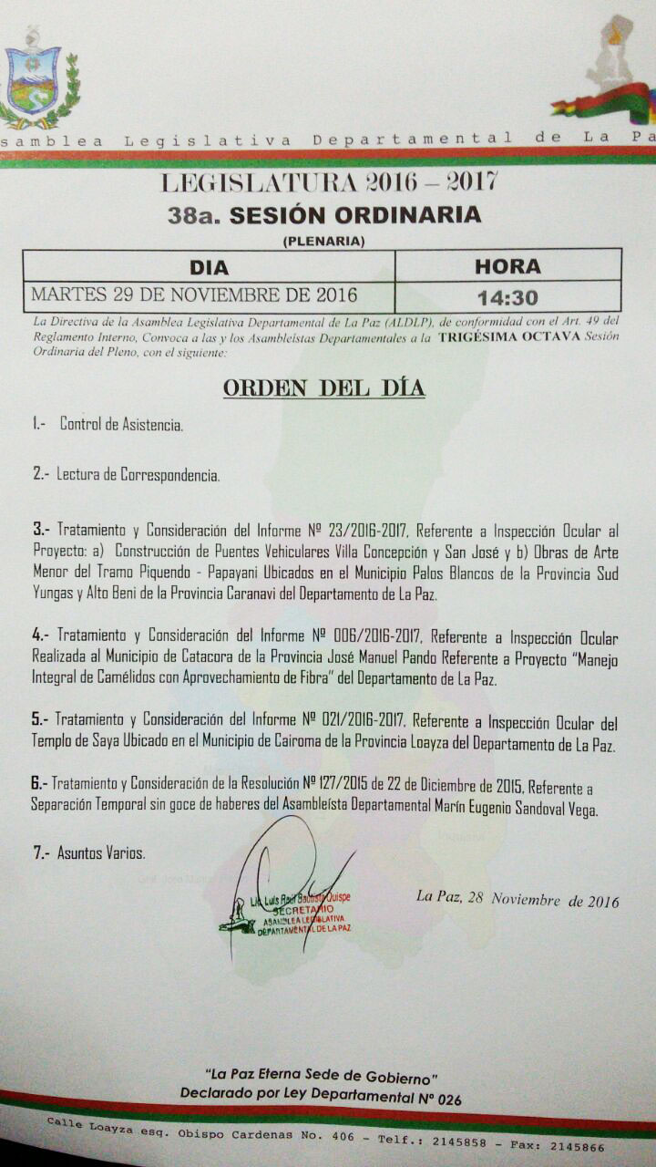 “Tratamiento y consideración de la resolución No127/2015 de 22 de diciembre de 2015 referente a separación temporal sin goce de haberes del asambleísta departamental Marín Eugenio Sandóval Vega”, señala la agenda de la sesión ordinaria No.38.