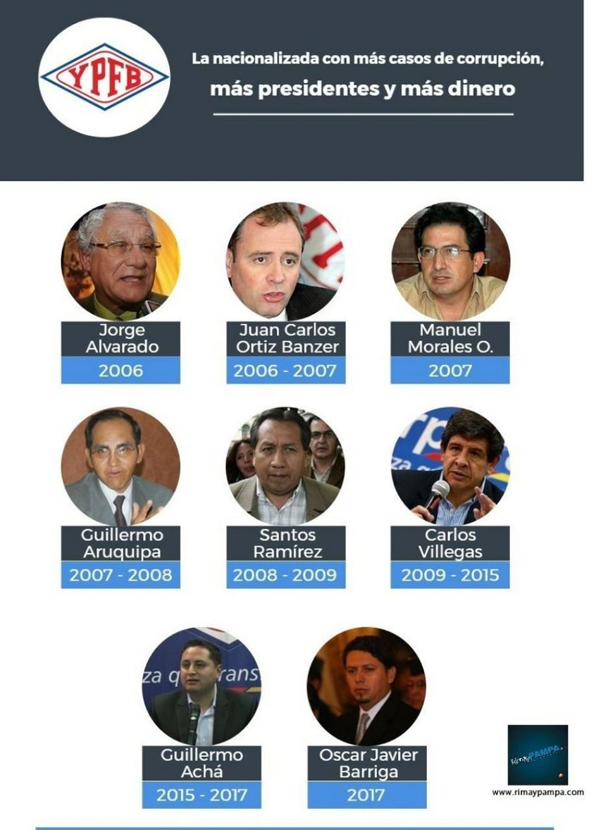 - El Presidente Evo Morales al igual que en 2006, cuando aceptó la renuncia de Jorge Alvarado, culpó a los medios de comunicación de hacer creer que hay corrupción en YPFB. “Lamento mucho, algunos medios de comunicación han sido responsables de hacer creer al pueblo que hay corrupción, y tal vez nuestro error ha sido que frente a esa campaña sucia y mentirosa cambiamos”, dijo en el acto de posesión del nuevo presidente de YPFB, Oscar Barriga.